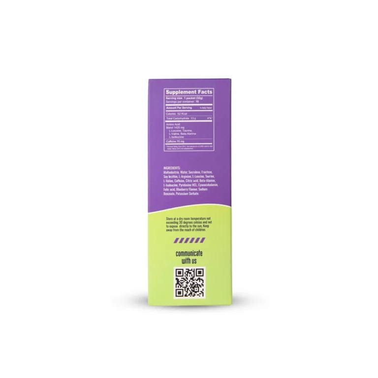 - 🧠 كافيين وأحماض أمينية للأداء: مدعم بـ 70 مجم كافيين عشان يزود اليقظة والتركيز، وكمان فيه أحماض أمينية زي L-Leucine و Taurine لدعم التحمل والحماية من الهدم العضلي.