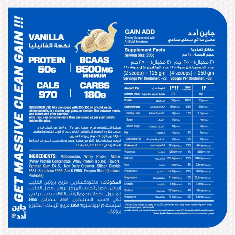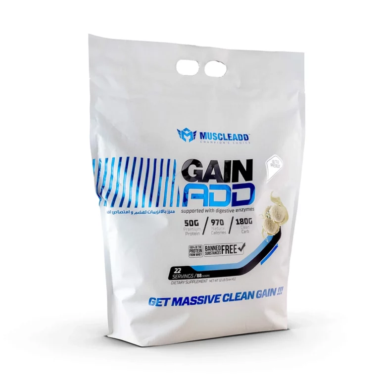 لو محتاج تضخيم عضلات ضخمة ونظيفة، MuscleAdd GAIN ADD هو المكمل اللي بيعمل شغل مظبوط. العبوة الضخمة دي (5.44 كجم) بتقدم أقوى دعم غذائي، مصممة عشان تديلك كل اللي محتاجه عشان تحقق زيادة ضخمة ونظيفة في الكتلة العضلية.