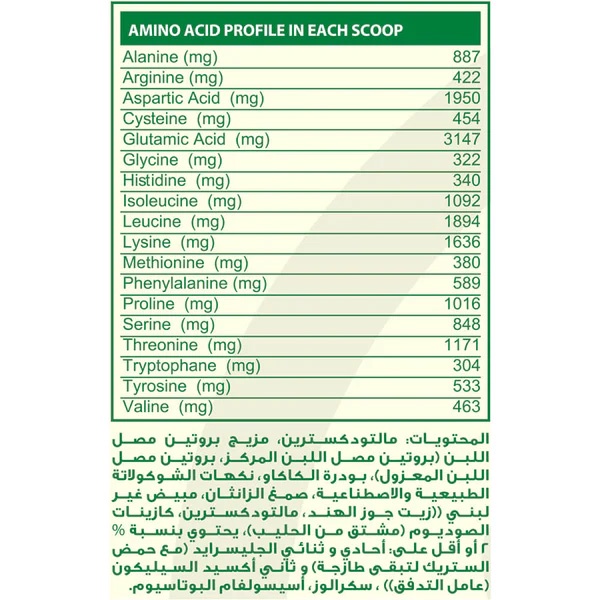 - 🌱 مدعم بالأحماض الأمينية: غني بالأحماض الأمينية زي الجلوتاميك أسيد (3147 مجم) و الليوسين (1894 مجم) في السكوب الواحد، ودي بتدعم الاستشفاء ونمو العضلات.