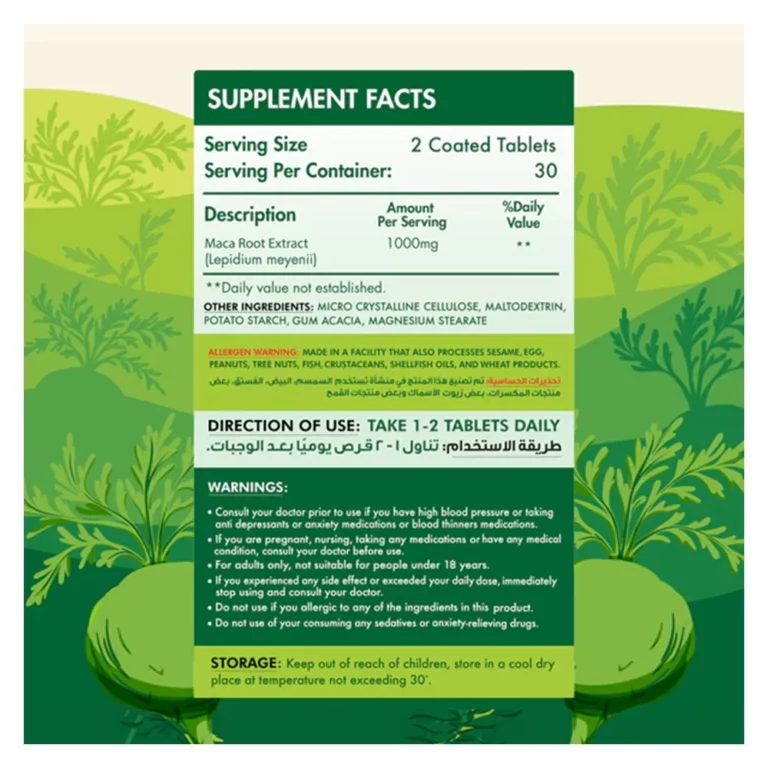 - ✅ 1000 مجم ماكا نقية: كل حصة (2 قرص) بتوفرلك 1000 مجم من مستخلص جذور الماكا النقي بتركيز عالي.